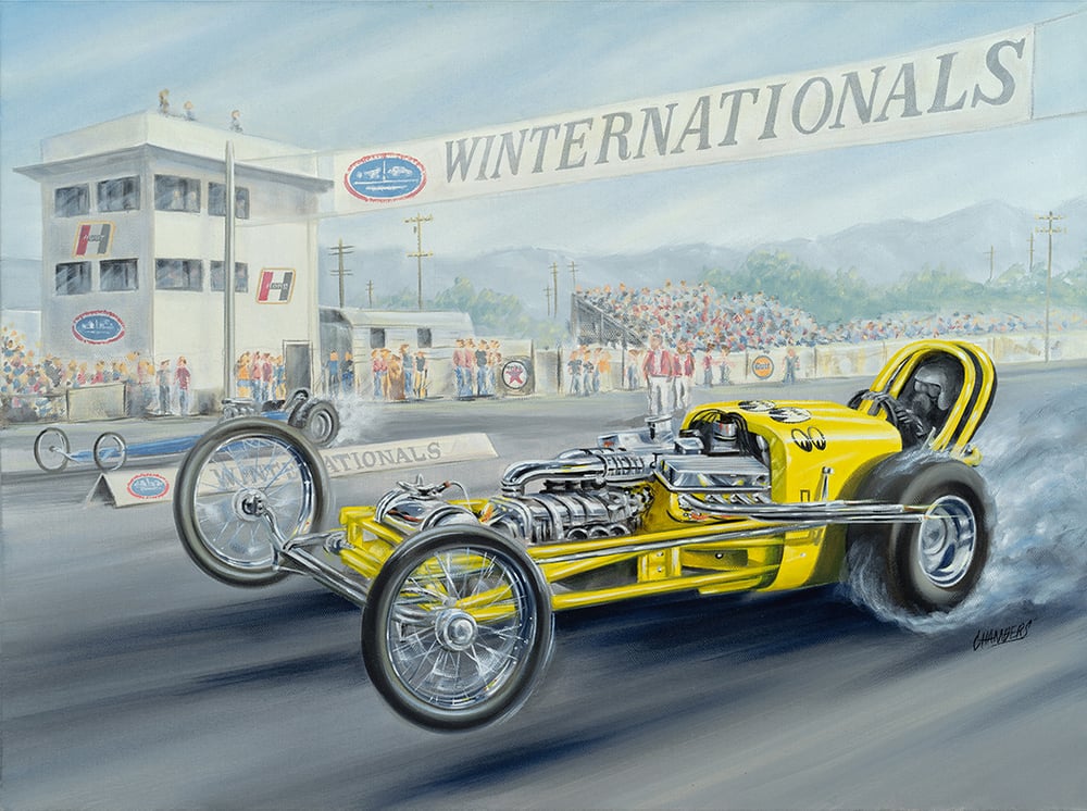 The original artwork was used for the box art for Atlantis Model's Mooneyes Dragster Painted on canvas using 1-Shot enamel paint.